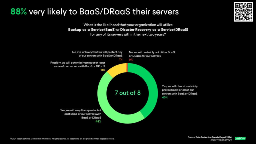 That said, it is not a surprise that an increasing number of organizations are embracing the use of cloud-powered data protection beyond simply leveraging a cloud-based repository. Many organizations initially added a cloud tier to their otherwise on-premises backup solution. For Veeam customers that includes both Cloud Connect solutions that are delivered through Veeam Cloud & Service Providers (VCSPs) as well as “capacity tiers” into Azure, Amazon, or Google storage. But for many organizations, simply having a survivable copy of data in a cloud does not meet the spirit of why they first embraced cloud-powered services. For many organizations, the real value comes from the M in Managed Service Provider — i.e., the management of data protection even more so than the repository itself. The 2024 Data Protection Trends Report does draw out the usage of self-managed cloud-powered backup solutions versus managed Backup as-a-Service (BaaS), in addition to quantifying the journeys of those that started with each of those modalities as well as those that switched. Collectively, seven out of eight (88%) organizations either currently use or anticipate using backup as a service to protect at least some of their data center servers within the next two years.